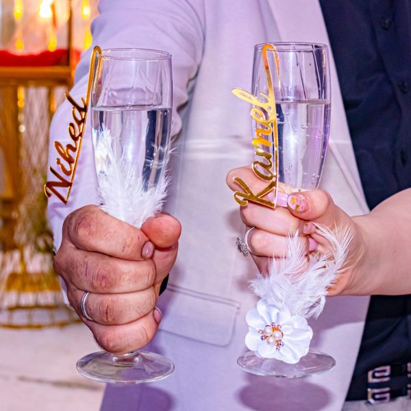 • Deux verres personnalisés avec les prénoms des mariés : parfaits pour porter un toast en l’honneur de votre engagement.