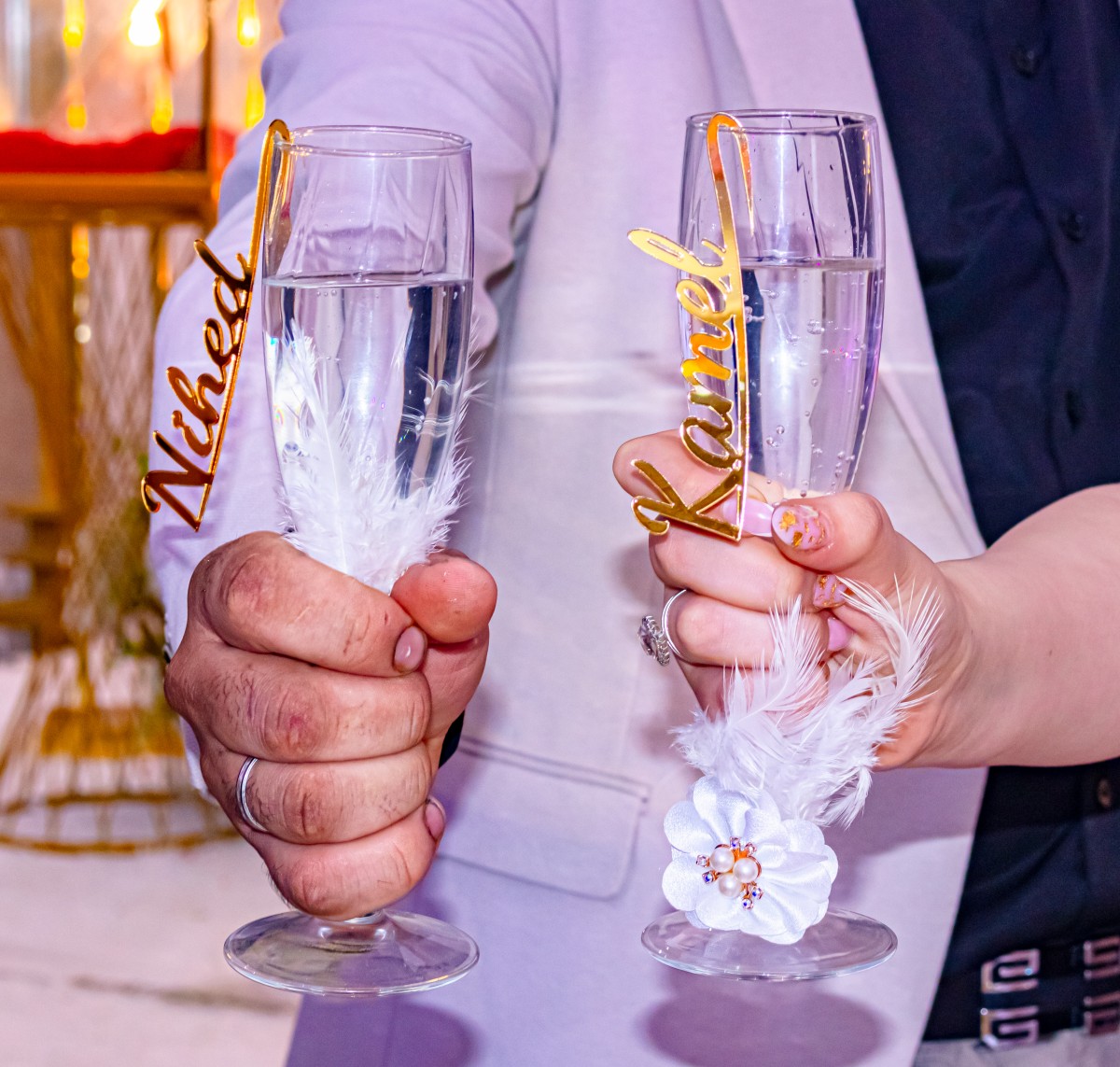 - Deux verres personnalisés avec les prénoms des mariés : parfaits pour porter un toast en l’honneur de votre engagement.